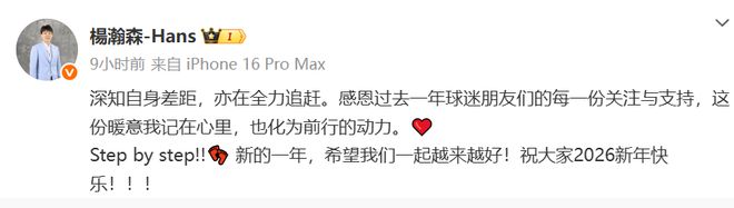 北京时间1月1日,开拓者球员杨瀚森更新社媒,为球迷送上新年祝福。他写道:“深知自身差距,亦在全力追赶。感恩过去一年球迷朋友们的每一份关注与支持,这份暖意我记在心里,也化为前行的动力。❤️Step by step!! 新的一年,希望我们一起越来越好!祝大家2026新年快乐!!!
